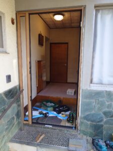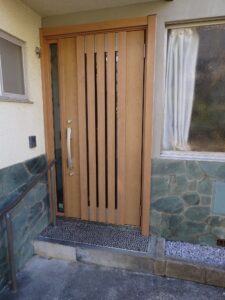 都内某所にて玄関ドアリフォーム工事を行いました。既存親子ドアでしたが手摺が後工事で設置されているため、ドアを選択すると開閉できないため片袖+ドアに変更して工事させて頂きました。築年数がかなり経過しているにも拘わらず水平、垂直はまずまずの状態でした。2日間工事でした。