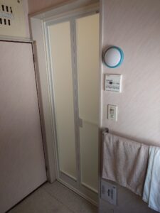 都内某所にて浴室ドア取替工事を行いました。既存ドア撤去→新規外枠取付→各所コーキング→ドア(折れ戸)吊り込み、調整という工事の流れとなります。採寸は別となりますが工事当日は約半日の工程となります
